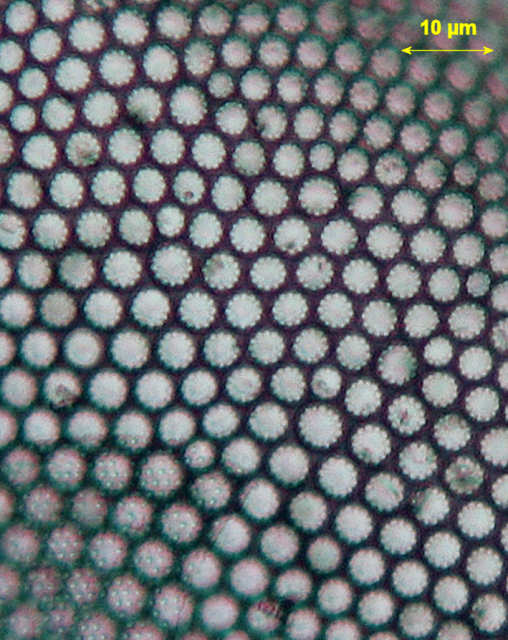 Diatoms have long been a favourite subject for microscopists, both for aesthetic and utilitarian reasons. The patterns resulting from their cell-wall structure can be very beautiful, especially if you have a love of patterns and geometry. These patterns can be so fine that they have also provided microscopists with a readily available and cheap means of testing the ability of their instuments to resolve fine detail. The pictures on this page of diatoms are of a mixture of marine and freshwater species. Diatoms are unusual in that as single celled algae they possess cell wals impregnated with silica - effectively the cell walls are made of glass. The cells are made of two halves, "frustules" held together by a kind of belt, called a "girdle". To appreciate the fine patterning, the frustules have to be specially cleaned and mounted for viewing in a highly refractive mountant. The patterns are only poorly visible in live diatoms, largely being obscured by chlorophyll and also by the fact that the refractive index of water is too low for really good resolution. Moiré pattern formed by fine markings in a centric diatomZeiss GFL Microscope Colouration caused by diffraction effects due to the very fine patternsZeiss GFL Microscope |
