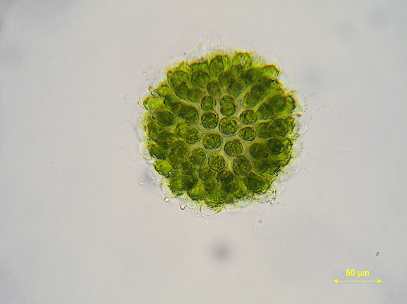 Gonium pectoraleThis is a free swimming algal colony, usually of 16 cells, the inset shows the colony in motion, and the flagella can be seen that provide propulsion Microscope: Zeiss Standard GFL