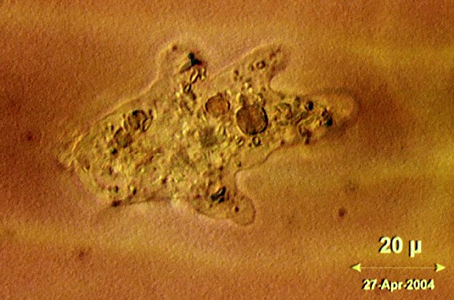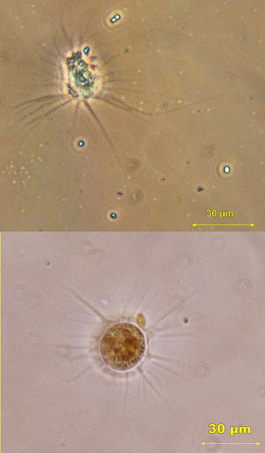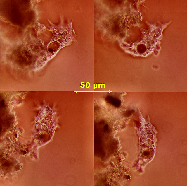 The lower image shows the fine pseudopia that attache the amoeba to its test (shell) Zeiss GFL Microscope |