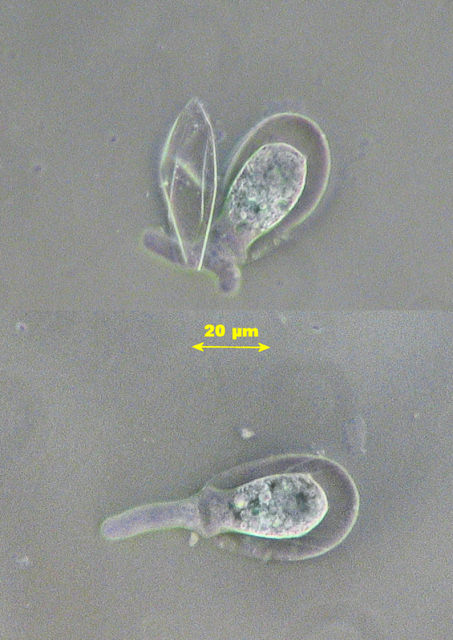 Stalk not visible in this picture Zeiss GFL microscope Camera: Canon Powershot S50, ISO200, F4.9, 1/400 sec Click here to view an animated .gif of the effects of focus change, demonstating the spherical nature of this organism