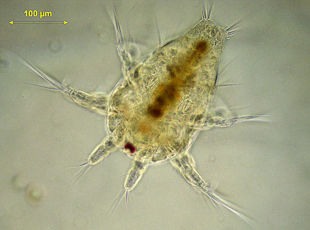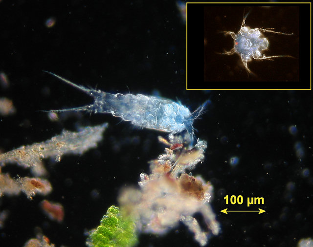 Canthocampus, with nauplius to same scale(inset) Zeiss GFL Microscope Sample from wet moss in garden, November 2004 |