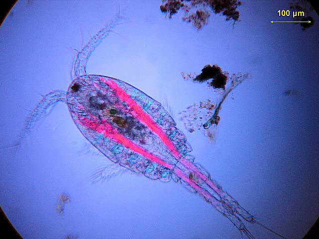 Zeiss GFL Microscope Camera: Canon Powershot S50, F4.9, ISO50 The above image clearly shows the single eye-spot that gives this creature its name. Cyclops is very common and is a very fast swimmer.