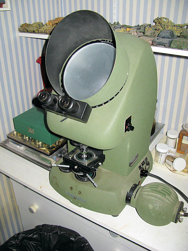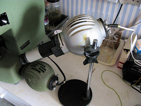 The Projectina microscope is an interesting projection microscope with a large in-built projection screen. To achieve a good image, lots of light is required and this is provided by 100W 12V halogen filament lamps. Naturally these get very hot and this is really the Achilles heel of the instrument. There are two lamps, one for transmitted light and one in a stand lamp for surface illumination. Both are provided with in-line IR filters, but these only serve to provide relatively cool light, but both lamp housings can get very hot indeed, as can the lamp lenses. The ceramic lamp fitting in my stand lamp cracked, probably from heat stress. I understand that the lamp lenses can also suffer heat damage, although I have been fortunate in this respect. The obvious cure was to upgrade the lighting to LED lighting. You can see how I did this in my article Converting a Projectina Microscope to LED Lighting in Micscape Magazine. The instrument is capable of producing very competent images and viewing can be toggled between eyepieces and screen.