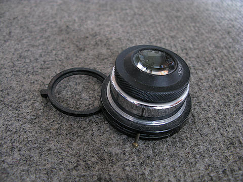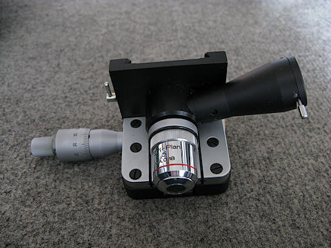 Depth micrometer This is an epi lens with illumination from a stand lamp through the side port on the upper right of this image. This also has an iris diaphragm.
