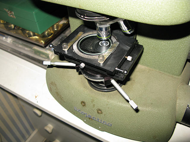 Gliding Stage and Quadruple Nosepiece The gliding stage is a very nice feature and has a good smooth action. The quadruple nosepiece can just be seen and this has thumbwheel selection of normal, polarising filter and polarising filter with retardation plate. The lower polariser is designed to fit over the field lens housing. The binocular head can be replaced with a monocular tube, which I have also used for photomicrography. Originally, the projection screen could be replaced with a Polaroid camera back, but film is no longer easily available, although I do have the camera back and viewing screen.